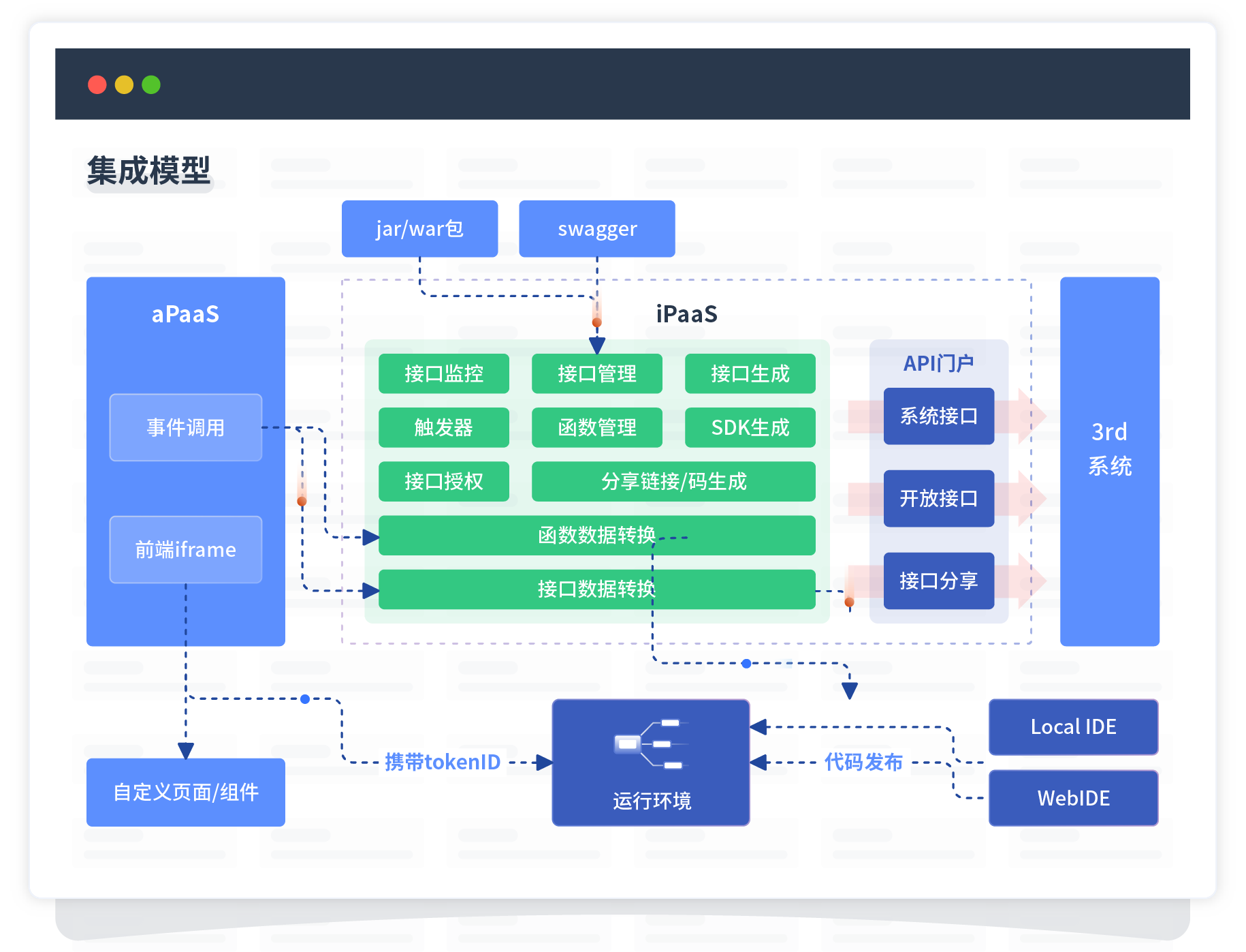 集成模型包括平台本身前、、、后端能力的扩展,,,也支持通过API门户和第三方系统进行交互。。。