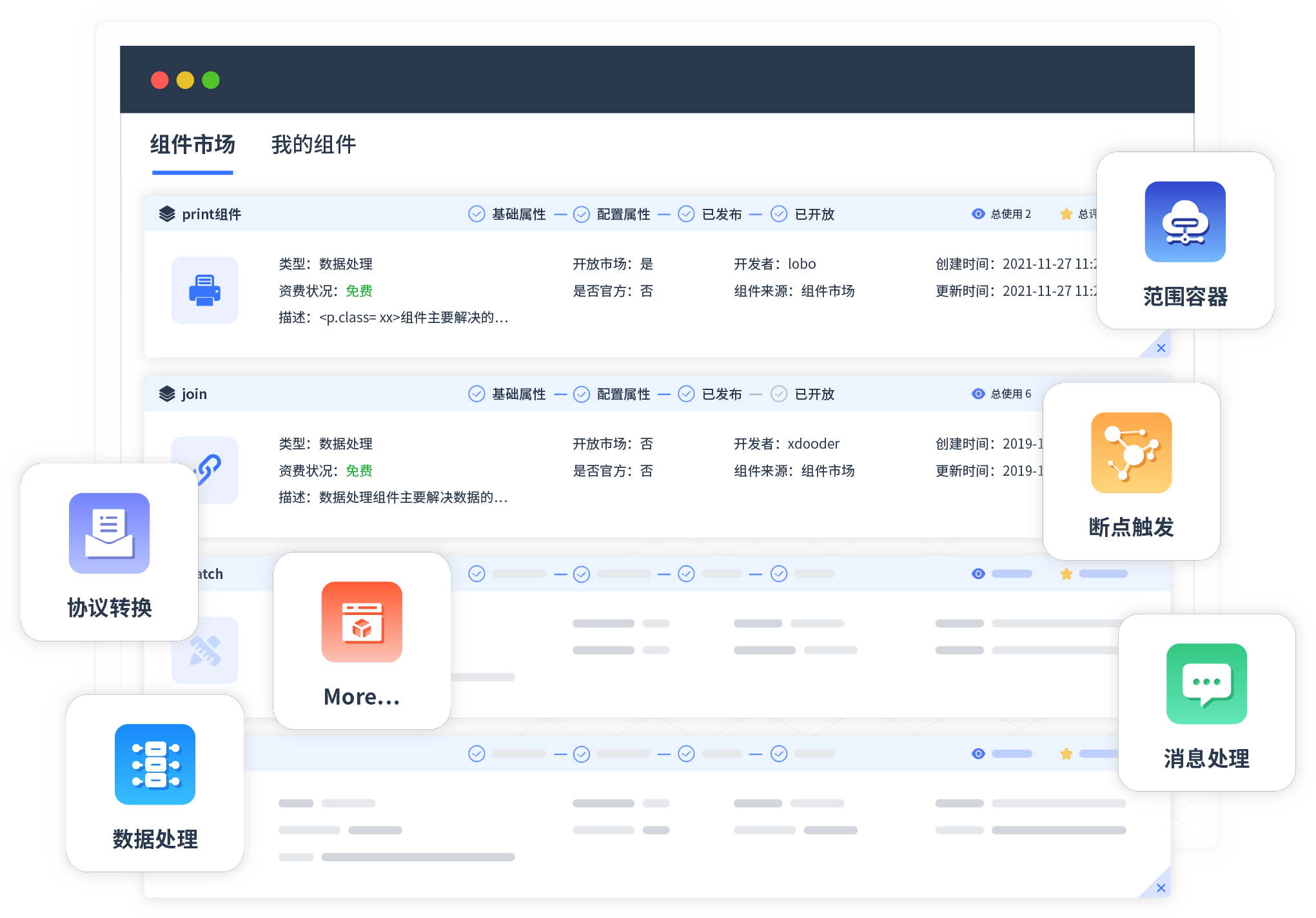 针对集成场景,,,圆梦钱包提供组件市场,,,例如协议转换、、消息处理、、、文件操作等。。。除平台提供的组件外,,客户可以自定义所需组件。。